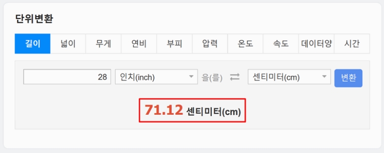이제 직접 변환을 해볼게요. 예를 들어 내가 사려는 바지 사이즈가 28인치라면, 숫자 입력 칸에 '28'을 넣고 단위를 '인치'로 맞추면 돼요. 그러면 결과값으로 '71.12 센티미터(cm)'가 바로 나오는 걸 볼 수 있죠. 내 허리둘레를 줄자로 재 본 값과 비교해서 사이즈가 맞을지 가늠해볼 수 있어서 정말 유용하더라고요.